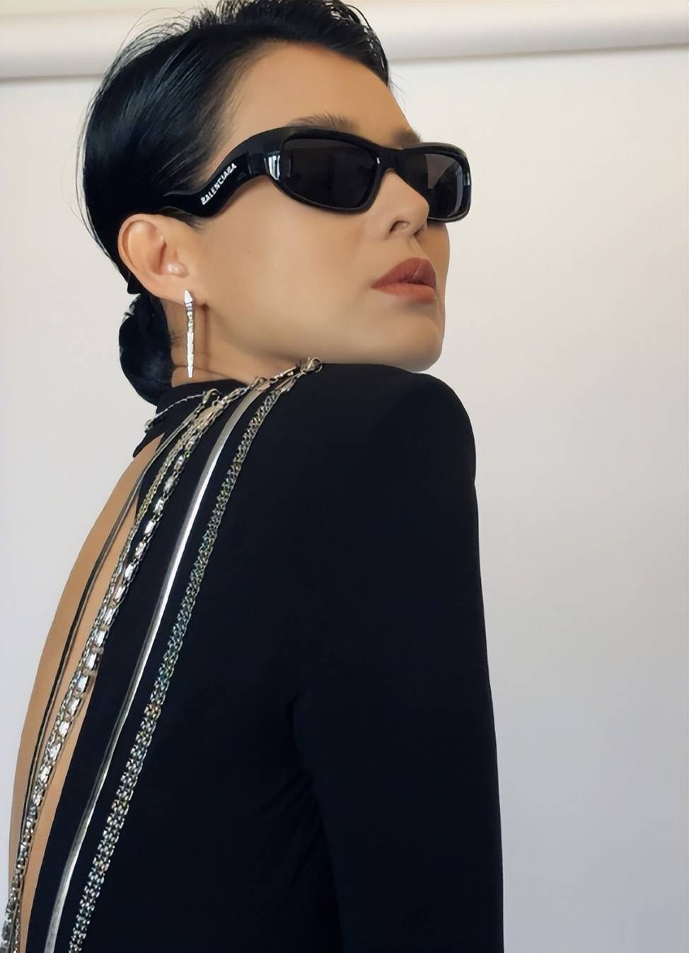一袭黑色紧身露背长裙,将她婀娜的身材展现的淋漓尽致,腰臀比绝佳,银色的链条设计更加高级。